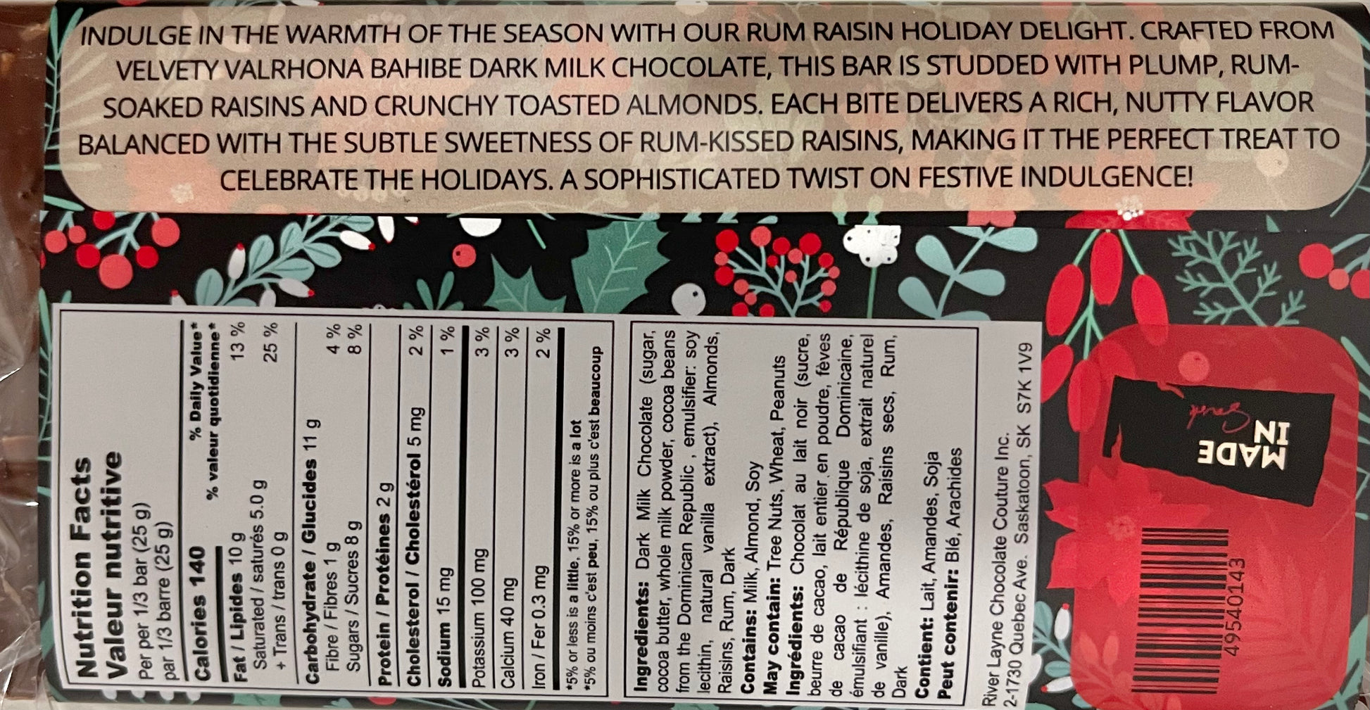 Indulge in the warmth of the season with our Rum Raisin & Toasted Almond delight. Crafted from velvety dark milk chocolate, this bar is studded with plump, rum-soaked raisins with crunchy toasted almonds.